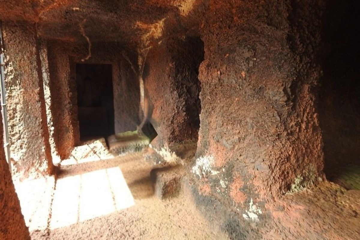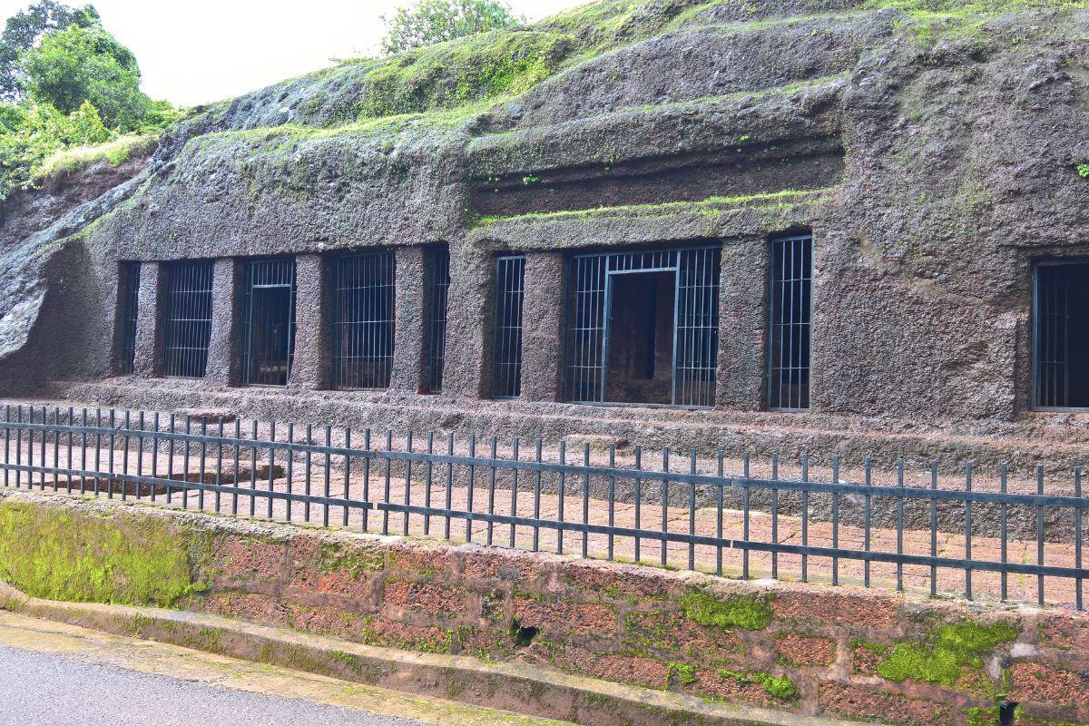 Arvalem Caves appear without warning or ceremony. The laterite outcrop rises modestly and plain, its five entrances arranged in a straight line like ordinary doorways rather than temple gates. There is no towering shikhara reaching skyward, no elaborate carvings announcing divine presence, just bare rock shaped by human hands into a functional shelter. The reddish-brown laterite, formed by tropical weathering, gives the structure an earthy, humble appearance that makes visitors pause and look twice.