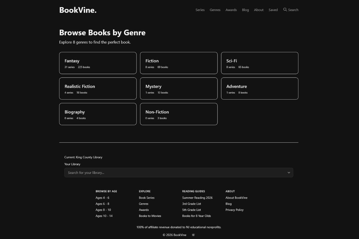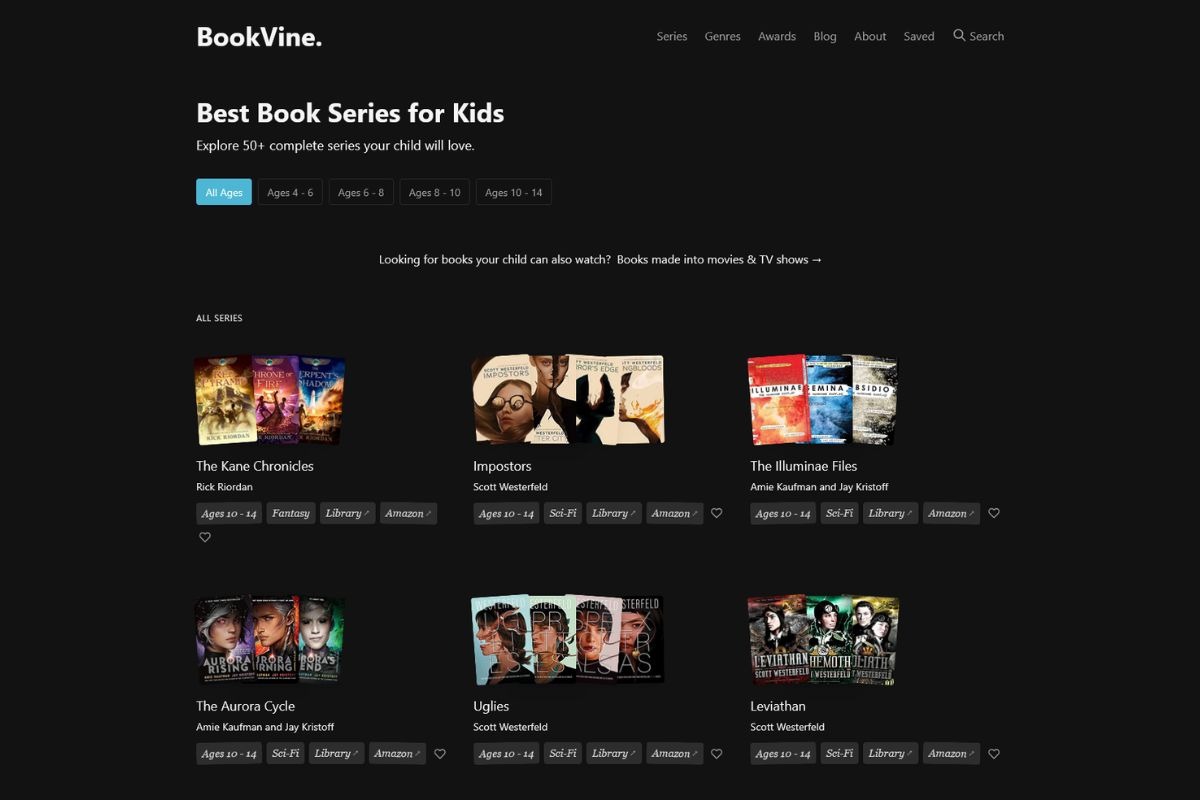 BookVine.io began as one teenager’s response to watching kids enjoy stories despite having almost nothing else. Today, the platform catalogues more than 500 titles across 50 series, each with hand-written reviews, age ratings, and direct links to libraries and retailers. The site costs nothing to use and runs without advertisements. Shravan built it at age 13 using Webflow, a visual design tool that let him skip traditional programming. He wrote every review himself.