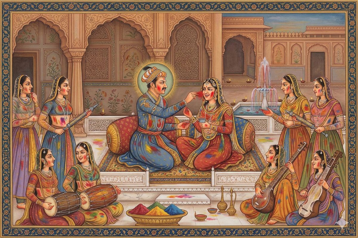 Mughal miniature paintings provide the most vivid records of imperial Holi celebrations. These artworks, produced in court workshops, show emperors in private spaces surrounded by women, musicians, and servants, all drenched in pigments. The paintings served both as documentation and as idealised representations of court life.