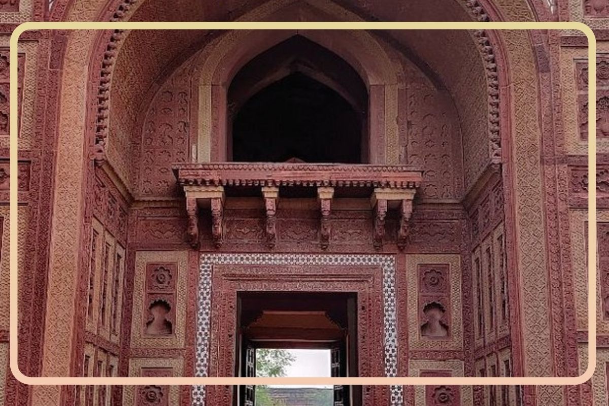 The genius of Kanch Mahal lies in its ability to solve problems while creating beauty. Picture a square building with a central hall topped by a vaulted roof. Four corner rooms, each designed with ventilating openings, allowed air to flow freely through the structure. This was no accident. Agra’s summers are brutal, and Mughal architects knew exactly how to combat the heat without the aid of modern technology. The walls rose from brick masonry, then dressed themselves in finely carved red sandstone, transforming functional surfaces into works of art. Glazed tiles, though mostly lost to time now, once covered portions of the building in brilliant colours. The decorative elements tell their own story.