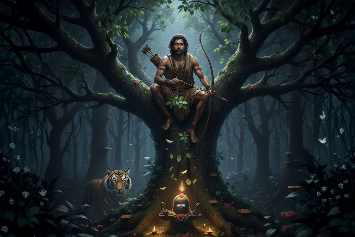The Shiva Purana narrates how a hunter named Chandramauli, lost in the forest on a dark Phalgun night, climbed a bilva tree to escape a tiger. Through the night, he stayed awake, plucking leaves to remain alert. These leaves fell upon a Shiva lingam hidden below. By dawn, his accidental vigil and unintentional offerings earned him moksha. Shiva granted liberation for this unwitting devotion.