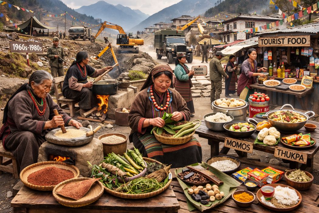 The 1960s brought border conflicts between India and China that fundamentally altered Monpa life. Military bases required road construction. Supply chains followed, delivering wheat flour, cooking oil, commercial spices, and vegetables like cauliflower and tomatoes to villages that had never seen them. The transformation accelerated in the 1980s when the Public Distribution System flooded communities with subsidised rice and wheat.