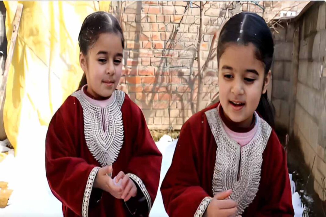 In the quaint town of Kandiwara, Kokernag, Anantnag, the innocence of childhood pierced through the chill as twin sisters, Zeeba and Zainab, captured hearts with their gleeful video amidst the season’s first snowfall. Their contagious excitement, clad in traditional Kashmiri attire, lit up social media, drawing admiration from all corners.