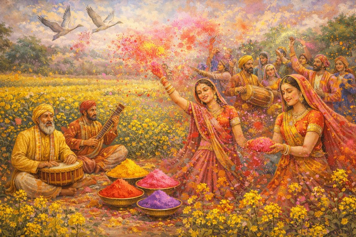 The three main terms that appear throughout this poetry carry specific associations. Rang, meaning colour, became shorthand for passion, divine love, and the vibrancy of existence itself. Poets used it to describe both romantic longing and mystical ecstasy. Gulal, the red powder central to Holi celebrations, evoked romance and festivity in equal measure. Basant, referring to spring and the festival of Basant Panchami, symbolised renewal and natural abundance.