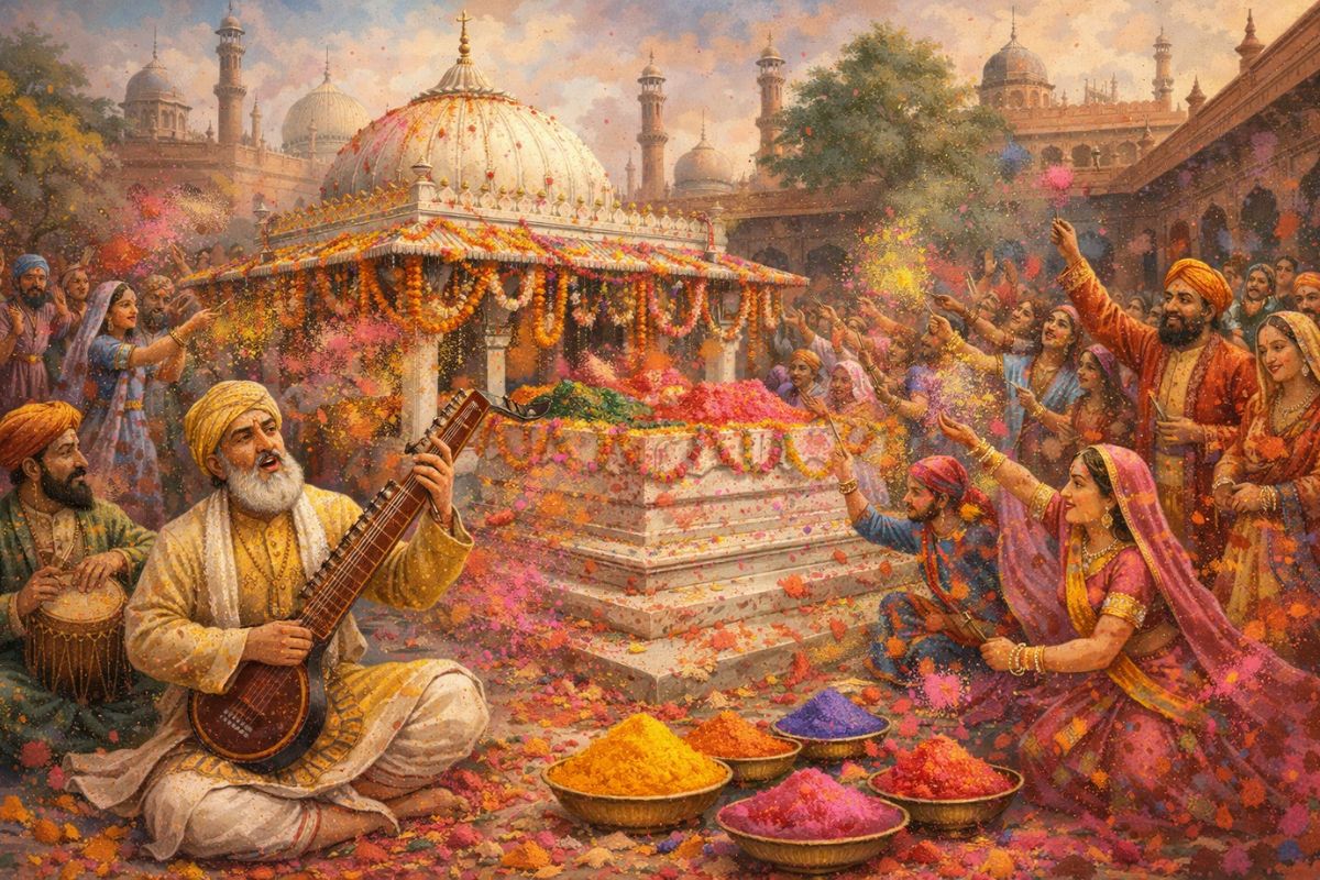 The deepest roots of this poetic tradition reach back to Amir Khusrau, the 13th-century poet and disciple of the Sufi saint Hazrat Nizamuddin Auliya. Khusrau composed qawwalis that have been sung at the Nizamuddin dargah in Delhi for over 700 years. His most famous Holi composition begins with the lines “Aaj rang hai hey maa rang hai ri / Moray mehboob kay ghar rang hai ri” (There is colour today at my beloved’s home).