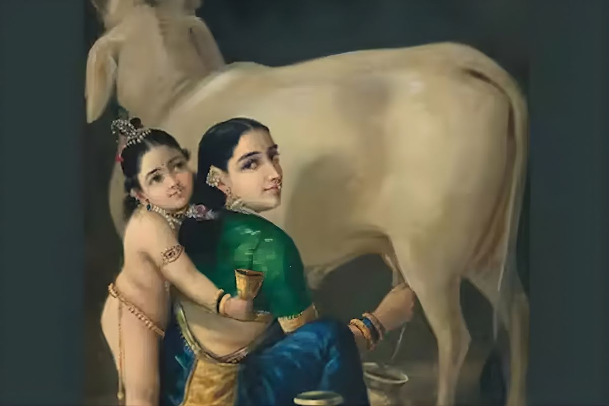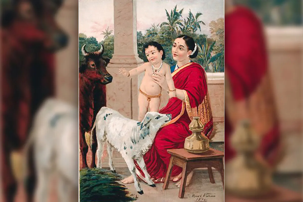 The Play of Light: Employing the European ‘Chiaroscuro’ technique, Raja Ravi Varma has cast a magical interplay of light and shadow upon Yashoda’s anchal (veil) and the herd of cows.